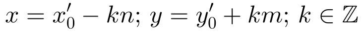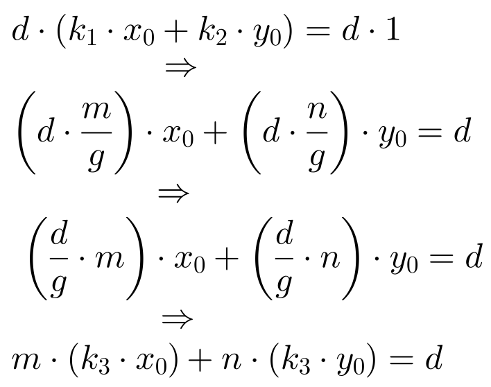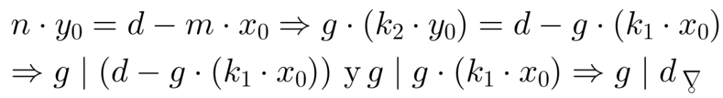 Si m. c. d (m, n)=g, entonces m. c. d. (m/g, n/g)=1; Haciendo k1=m/g, k2=n/g, k3=d/g y, por lo observado anteriormente, para d=1, existen enteros x0, y0 tal que