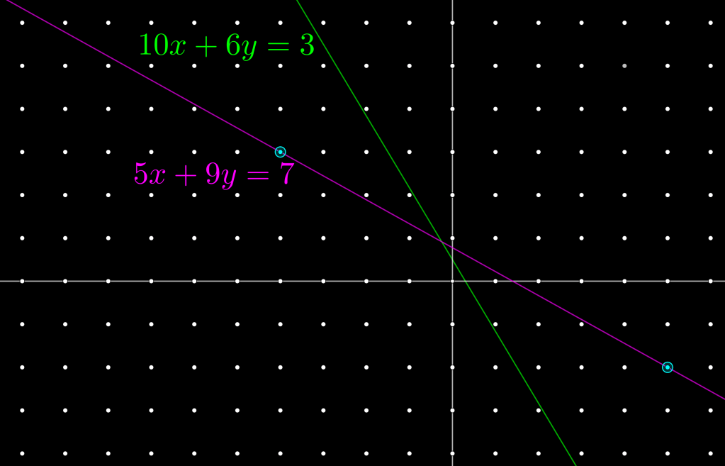 Ahora bien, si g | d, entonces, como se ha mostrado anteriormente, encontrar las soluciones enteras de la ecuación lineal: mx+ny=d, se reduce a encontrar las soluciones enteras de la ecuación: k1x+k2y=1, donde m=gk1; n=gk2; d=gk3; m. c. d. (m, n)=g (así, m. c. d. (k1=m/g, k2=n/g)=1). Y, como se muestra en la figura, no obstante que las dos rectas asociadas a las dos ecuaciones: k1x+k2y=1 y mx+ny=d, teniendo la misma pendiente y siendo una, mx+ny=d, la traslación de la otra, k1x+k2y=1. Las soluciones enteras de una no son las soluciones enteras de la traslación de la otra (ver Figura).