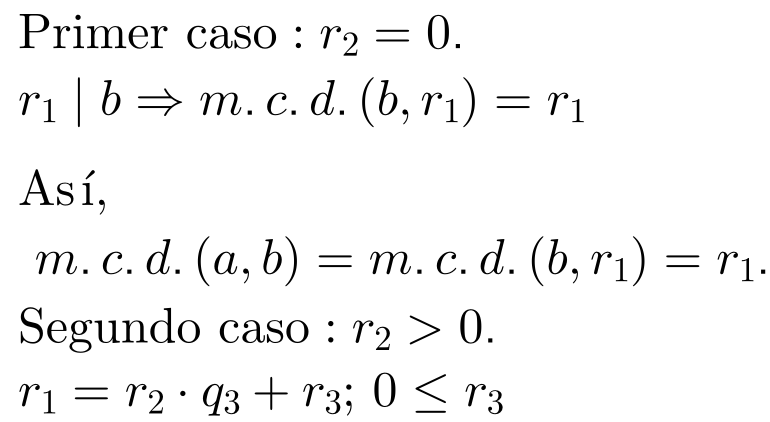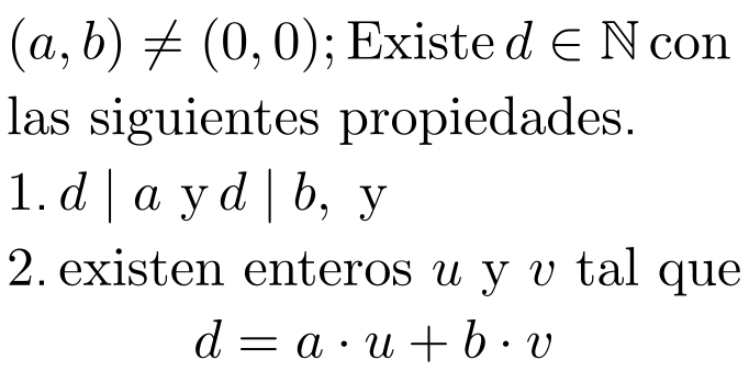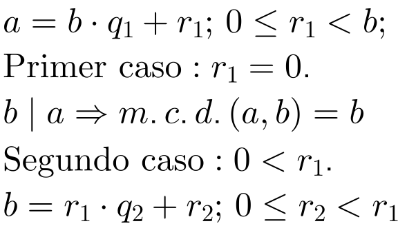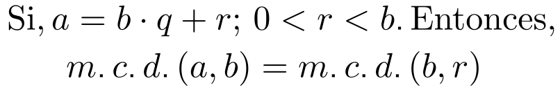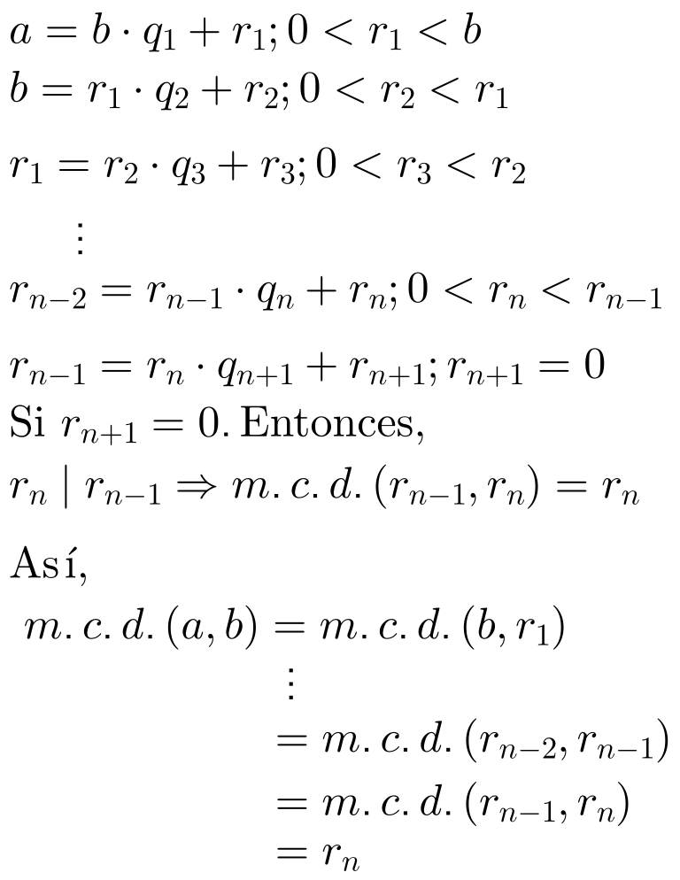 Por otro lado, el procedimiento anterior nos permite expresar al Máximo Común Divisor como combinación lineal entera de a y b. Despejando r1 de la primera igualdad, expresamos a r1 en términos de a y b: r1(a, b); Sustituyendo en la segunda igualdad y despejando r2, expresamos a r2 en términos de a y b: r2(a, b); Análogamente para r3, expresamos a r3 en términos de a y b: r3(a, b). En general, podemos expresar a rn en términos de a y b: rn(a, b), es decir, podemos expresar al máximo común divisor, rn, de a y b como combinación lineal entera de a y b.