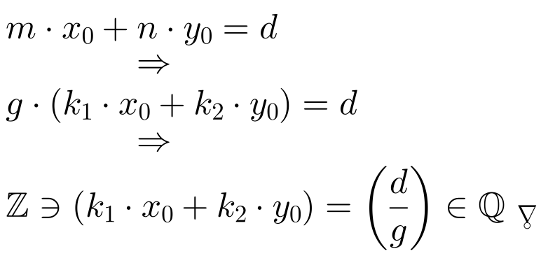 Afirmamos que la ecuación lineal no tiene soluciones enteras. En efecto, supongamos por, reductio ad absurdum, que existen enteros, x0 y y0, tal que
