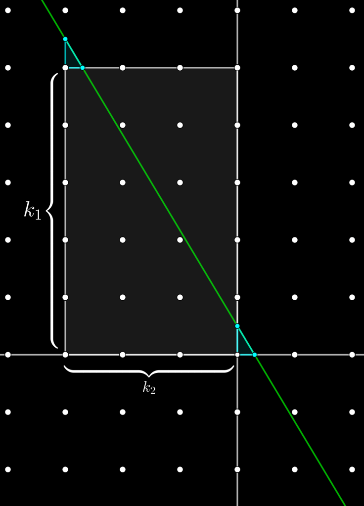 Notemos que si una línea recta: mx+ny=d, en un rectángulo como el que se muestra en la Figura, de base k2 y altura k1, no contiene puntos de coordenadas enteras pertenecientes a este rectángulo, entonces no contiene ningún punto del plano de coordenadas enteras. Lo cual sucede si m. c. d. g, de m y n, no divide a d. Donde k1=m/g y k2=n/g.