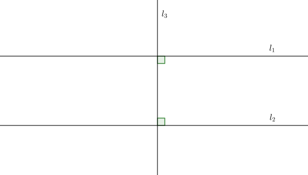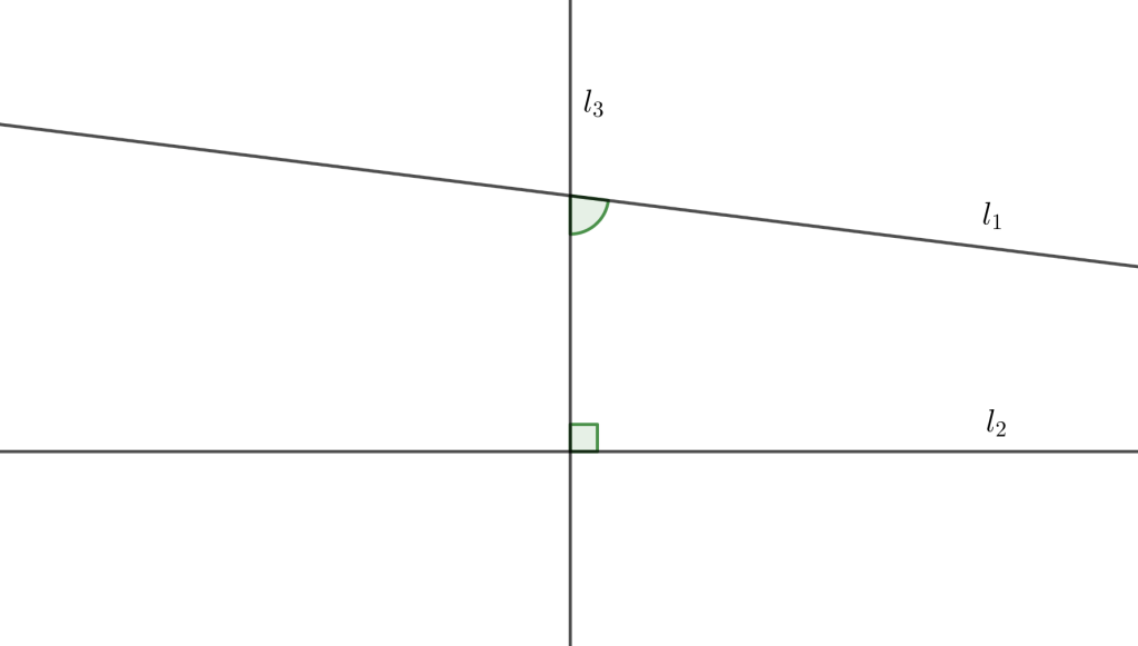 Se puede intuir que el comportamiento de l1 y l2 respecto a uno u otro lado de l3 es el mismo, es decir, que si l1 y l2 se cortan de un lado se tendrían que cortar del otro lado pero dos líneas rectas no pueden cortarse en más de un punto (equivalentemente, dos líneas rectas no pueden encerrar espacio). Así pues, dada la naturaleza de una línea recta, l1 y l2 tendrían necesariamente que ser paralelas, es decir, que al prolongarse indefinidamente de uno u otro lado de l3 nunca se cortan. Ahora bien, supongamos que l3 es ortogonal a l2 y con l1 hace un ángulo agudo, de manera que la suma de los ángulos internos del mismo lado es menor a 2R (180°).