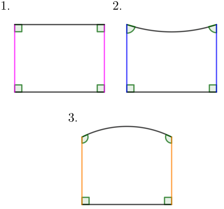 Si sobre un segmento tomado como base se levantan en los extremos dos ortogonales de la misma longitud y trazamos la línea que une los extremos de éstas, entonces los ángulos de la tapa de dicho cuadrilátero son siempre iguales, independientemente del quinto postulado, así existen tres posibilidades: