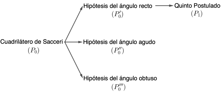 Ahora bien, no obstante que Girolamo Sacceri en, Euclides vindicatus, demuestra erróneamente el quinto postulado, podemos rescatar observaciones que son correctas y que desvelan la hipótesis que subyace a la naturaleza de los tres tipos de geometría a las que dan nacimiento, a saber, la geometría euclidiana, la geometría hiperbólica y la geometría elíptica, respectivamente: