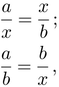 es decir, encontrar el lado, x, de un cuadrado de área igual a la de un rectángulo dado, ab; encontrar la altura, x, de un rectángulo de base dada, a, de área igual a la de un cuadrado dado: